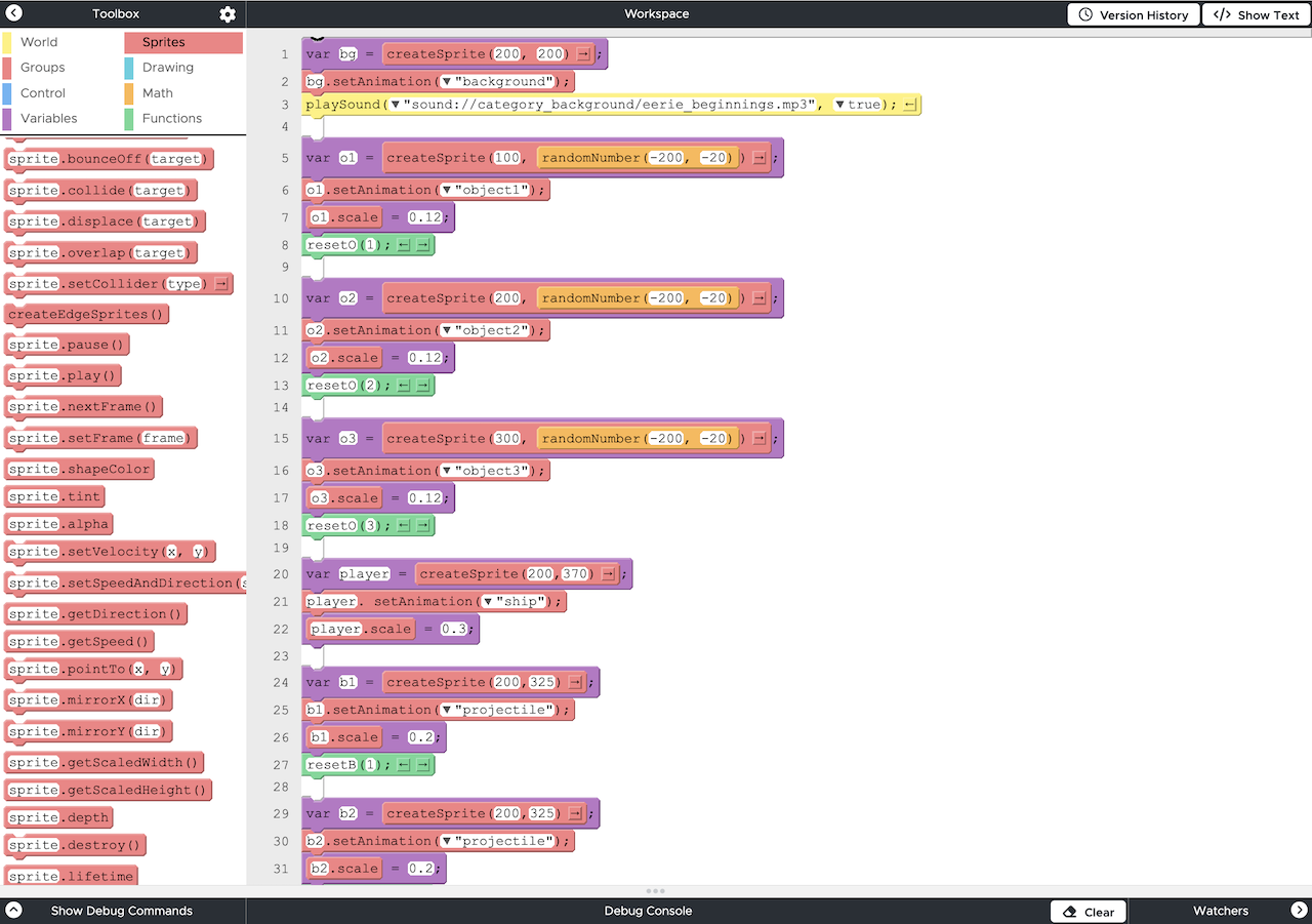 This project is written in JavaScript, and since this is developed under Code.org, an educational platform that provides coding lessons and activities for younger students and educators, it contains code blocks or built-in functions and methods like playSound(URL, loop) or .isTouching(target) as instances. An additional feature I would like to highlight from this platform is sprites and sprite functions, which I have primarily utilized for the project’s game components and operations. For those who may not be familiar with what “sprite” is, it is “a two-dimensional (2D) graphical object used in computer graphics, particularly in video games” (Andrew Löw, What is a sprite?).