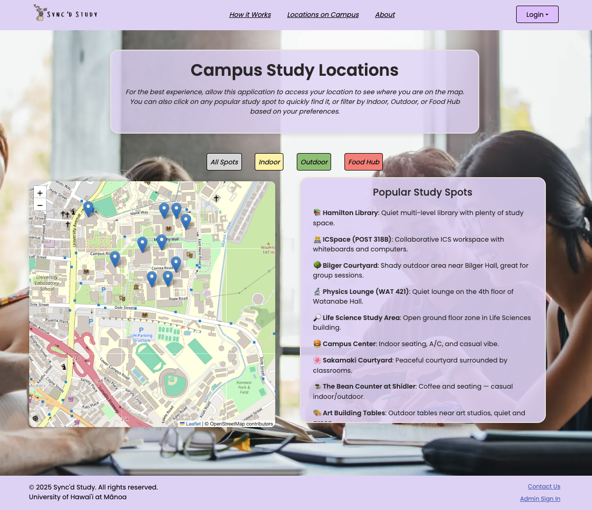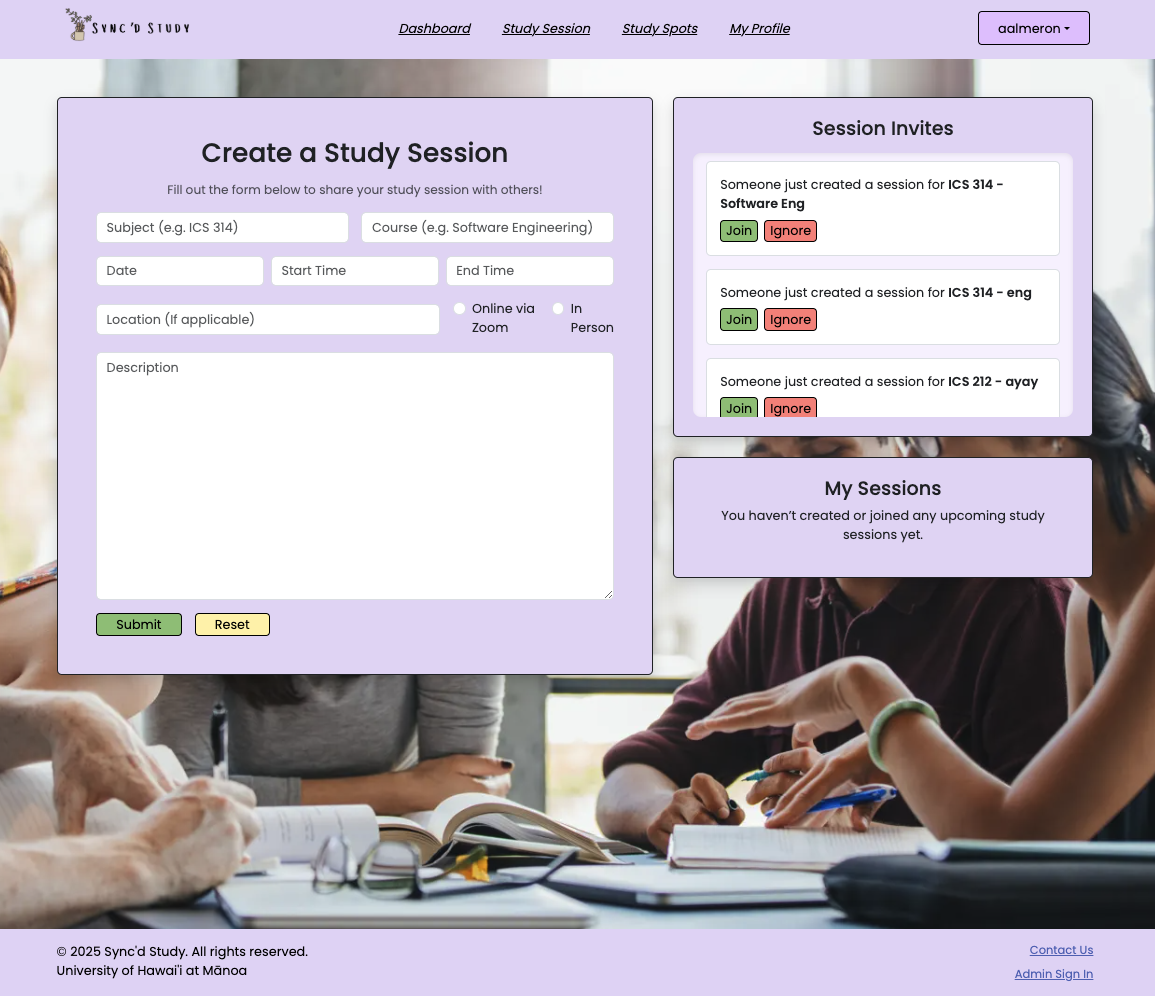 Sync’d Study is a web application that my team and I built for our ICS 314: Software Engineering final project. It is designed for UH Mānoa students, providing them space to collaborate, connect with their peers, create or join study sessions, and stay motivated throughout the semester. Throughout the development process, we’ve utilized the GitHub Project Board to evenly split the tasks/issues, track our progress using the IDPM (Issue Driven Project Management) tracker, and maintain and structure our workflow.